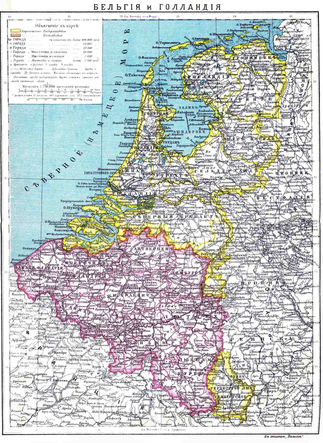 Пространство и население. Бельгия находится между 20°12' и 23°47' вост. долг. (от Ферро) и между 49°30' и 51°30' с. ш.; на С граничит с Голландией, на В — с голландским Лимбургом, Рейнской Пруссией и великим герцогством Люксембургским, на Ю и ЮЗ — с Францией, на СЗ — с Немецким морем. Наибольшее протяжение она имеет в направлении от СЗ к ЮВ, от Остенде до Арлона (270 км), в направлении от Ю к С от Шимэ до Турнгута (Turnhout, 180 км). Вся площадь страны занимает пространство в 29465,16 кв. км, которые распределяются следующим образом между девятью провинциями государства: Люксембург (главный город Арлон) — 4417,76, Гено (главный город Берген, франц. Монс) 3721,62, Намюр (главн. гор. Намюр) — 3660,25, Брабант (гл. гор. Брюссель) — 3282,96, Западн. Фландрия (гл. гор. Брюгге, Bruges) — 3234,67, Вост. Фландрия (гл. гор. Гент, Geand) — 2999,95, Люттих (гл. гор. Люттих, Li è ge) — 2897,88, Антверпен (гл. гор. Антверпен, Anvers) — 2831,73, и Лимбург (гл. гор. Гассельт) — 2412,34. По числу своего населения, состоящего из 6093798 чел. (к 1 янв. 1880), так что на один квадратный км приходится 207 чел., Б. занимает относительно первое место между наиболее населенными государствами европейского материка. Если рассматривать ее населенность по провинциям, то населеннее всех других оказываются Брабант и Восточная Фландрия, где на 1 кв. км приходится 336 чел., тогда как в Люксембурге только до 50 чел. В 1842 г. население сравнительно с 1831 г. возросло на 7,59 проц., с 1840 до 1850 — на 8, 67, с 1850 до 1860 почти на 10, с 1860 до 1880 — на 10 проц., с 1880 г. до конца 1882 г. — на 9,2 пр. Население Б. состоит из смеси племен германского и кельто-галльского происхождения, в которой особенно выдаются племена фламингов и валлонов, сохранившие до сих пор свои наречия — фламандское и валлонское. Языком официальным и образованных классов является преимущественно французский, хотя конституция не дает преимущества ни одному из наречий, и говорящих на фламандском языке по переписи 1880 считалось 44, 9 проц., франц. — 40,5, на обоих язык. — 7,6 проц. Большинство населения принадлежит к римско-католическому вероисповеданию. Протестантов до 20000, евреев — до 3000. Во главе католической иерархии стоит архиепископ мехельнский (de Molines) и пять епископов: в Брюгге, Генте, Доорнике (Турнэ), Намюре и Люттихе. Незначительные протестантские общины, находящиеся в больших городах и сельских общинах, разделяются на англиканские и реформатские.