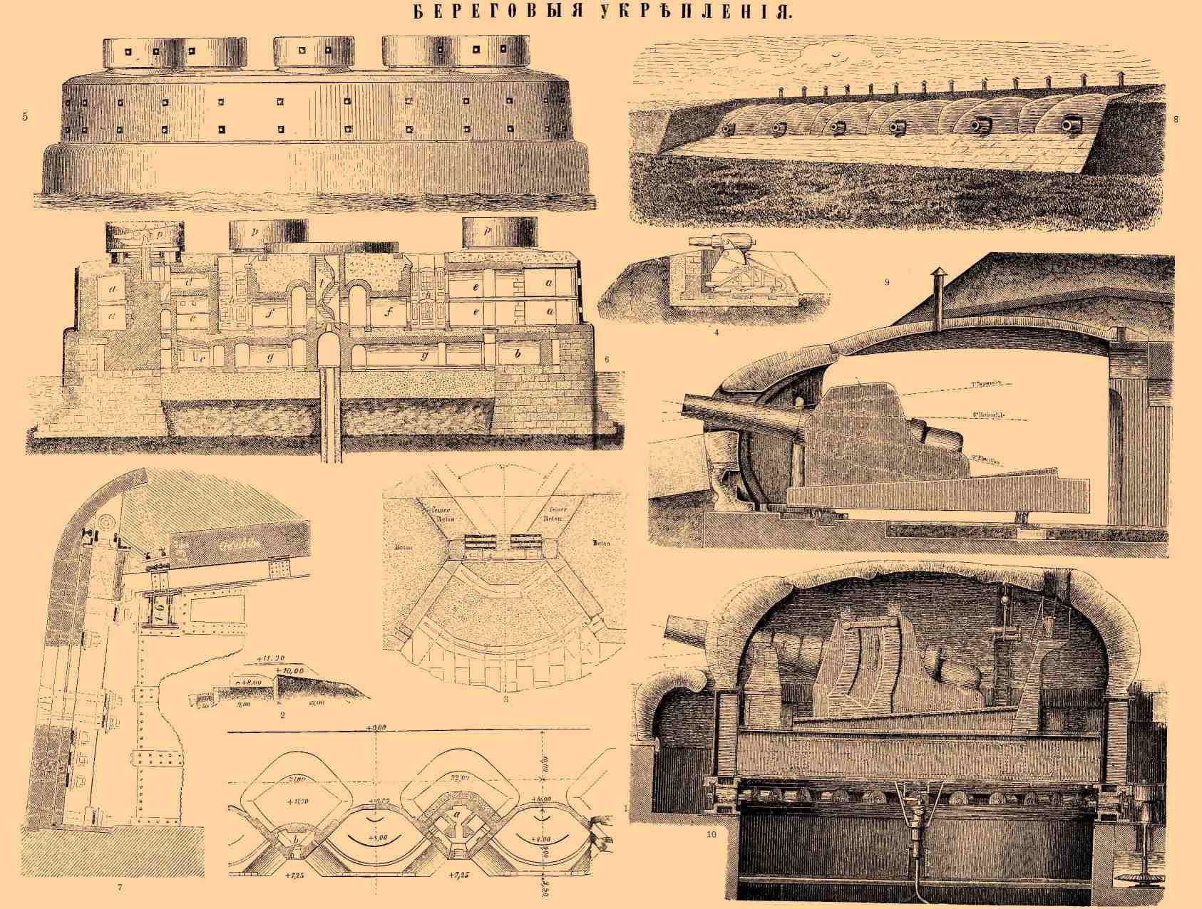 Там, где при устройстве береговых верков стеснялись пространством, где необходимо было распределить орудия в несколько ярусов, где требовалось полное закрытие от продольных и тыльных выстрелов — там до появления броненосцев и нарезных орудий прибегали к устройству казематированных батарей и башен. В последующие годы мы видим самые разнообразные применения железной брони как при усилении батарей и фортов, так и при возведении новых.