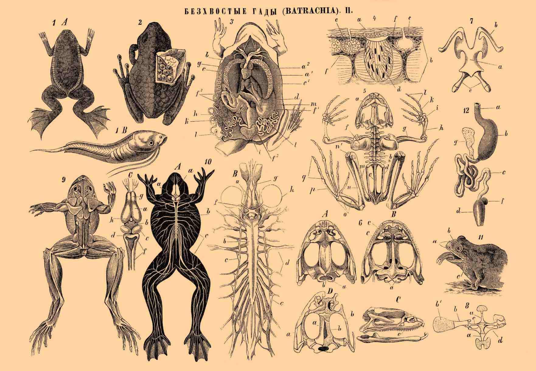 Рис. 1. Дактилера капская (Dactylera capensis). A. взрослое состояние. B. Личинка (головастик). Рис. 2. Спинномешочница (Notodelphys ovifera); с одной стороны кожа спины разрезана и отворочена в сторону, чтобы можно было видеть спинную суму с заключающимися в ней яичками. Рис. 3. Общее расположение органов в теле зеленой лягушки (Rana esculenta): a — сердце: a1 — желудочек сердца, a2 — предсердие, b — кровеносные сосуды (артериальные стволы), сообщающиеся с сердцем; c — печень; c1 — желчный пузырь; d — поджелудочная железа; f — пищеварительный аппарат: f1 — желудок, f2 — тонкая кишка, f3 — толстая кишка; g — легкое; h — почка; i — мочевой пузырь; k — яичник; l — яйцепровод, m — селезенка. Рис. 4. Поперечный разрез кожи лягушки: a — кожица (epidermis), b — собственно кожа (cutis sive derma), c — маленькая кожная железка; d — большая кожная железка; f — хроматофор (пигментная клетка). Рис. 5. Скелет зеленой лягушки (Rana esculenta), сзади: a — череп, b — позвоночный столб, c — крестец, d — тазовая кость, f — лопатка, g—l — кости передней конечности: g — плечевая кость, h — кости среднеплечия, или предплечья, i — кости запястья, k — кости пясти, l — суставы пальцев; m—q — кости задней конечности: m — бедренная кость, n — кости голени, o — кости пятки, p — плюсневые кости, q — суставы пальцев. Рис. 6. Череп зеленой лягушки (Rana esculenta). A — сверху, B — снизу, C — сбоку: a — мыщелок затылочной кости, b — затылочная дыра, c — зубы; D — череп сверху, слева изображены отдельные кости (a), а справа кости черепа сняты и видны лежащие под ними хрящи (b), которые составляют первичный хрящевой череп. Рис. 7. Подъязычная кость обыкновенной жабы (Rufo vulgaris): a — тело подъязычной кости, b — рога подъязычной кости, c — остатки жаберных дуг. Рис. 8. Грудина и плечевой поясок зеленой лягушки (Rana esculenta): a — грудина или грудная кость, b — лопатка, b1 — надлопаточный хрящ, c — ключица, d — воронья кость. Рис. 9. Мышцы (мускулатура) зеленой ягушки (Rana esculenta). Рис. 10. Нервная система зеленой лягушки (Rana esculenta): A — головохребетная нервная система в теле животного, сверху a — головной мозг, b — спинной мозг, c — нервы. B — Головохребетная и симпатическая нервная система, выделенная из тела, снизу: a — головной мозг, b — спинной мозг, c — узлы симпатической нервной системы, d — нервы спинного мозга, f — зрительный нерв, g — обонятельный нерв, h — глаз. C — отдельный головной мозг: a — полушария головного мозга, b — промежуточный мозг, или зрительные бугры, c — средний мозг, или двухолмие, d — малый мозг, или мозжечок, f — продолговатый мозг, g — обонятельная долька, h — так называемая мозговая железка (третий зрительный центр). Рис. 11. Голова бурой лягушки (Rana temporaria) сбоку, с открытым ртом: a — ноздря, b — глаз, c — барабанная перепонка (слуховой орган). Рис. 12. Пищеварительные органы бурой лягушки (Rana temporaria): a — пищепровод, b — желудок, c — тонкая кишка, d — толстая кишка, f — селезенка, g — поджелудочная железа.