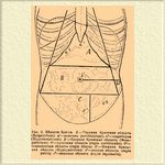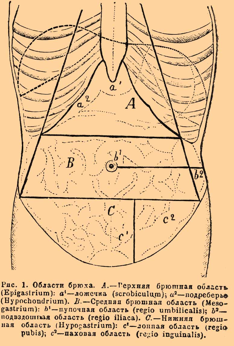 Рис. 1. Области брюха. А. — Верхняя брюшная область (Epigastrium): а 1 — ложечка (scrobiculum); a2 — подреберье (Hypochondrium). B. — Средняя брюшная область (Mesogastrium): b1 — пупочная область (regio umbilicalis); b2 — подвздошная область (regio iliaca). С. — Нижняя брюшная область (Hypogastrium): с 1 — лонная область (regio pubis); с 2 — паховая область (regio inguinalis).