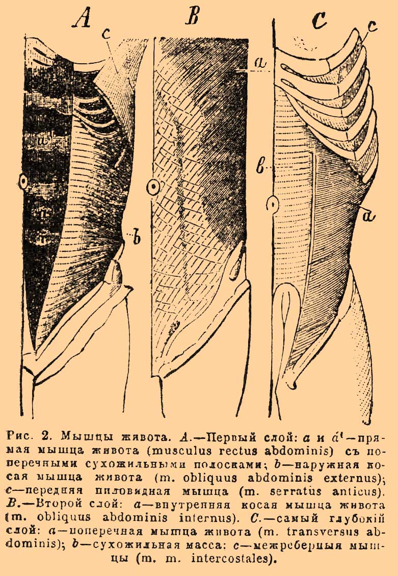 Рис. 2. Мышцы живота. А. — Первый слой: а и а 1 — прямая мышца живота (musculus rectus abdominis) с поперечными сухожильными полосками; b — наружная косая мышца живота (m. obliquus abdominis externus); с — передняя пиловидная мышца (m. serratus antic us). В. — Второй слой: а — внутренняя косая мышца живота (m. obliquus abdominis internus). С. — самый глубокий слой: а — поперечная мышца живота (m. transversus abdominis); b — сухожильная масса; с — межреберные мышцы (m. m. intercostales).