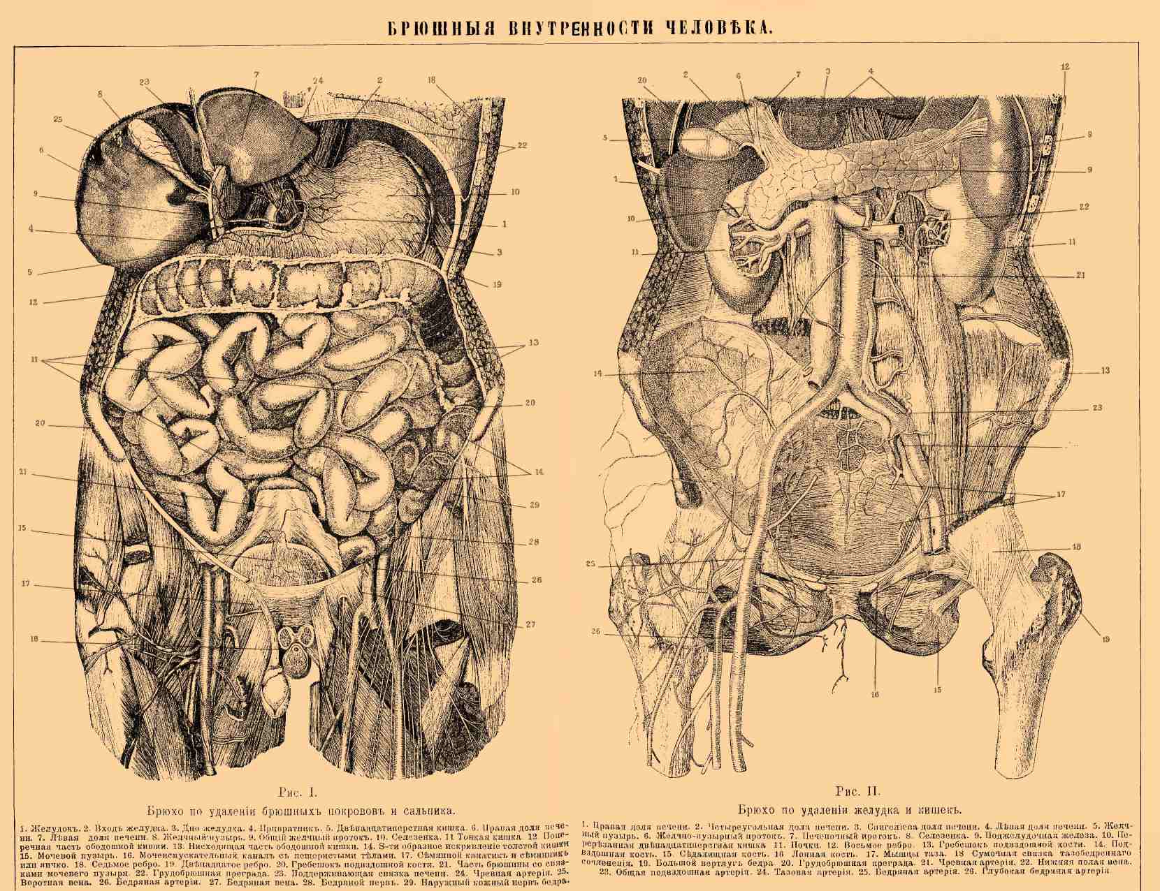 1. Желудок. 2. Вход желудка. 3. Дно желудка. 4. Привратник. 5. Двенадцатиперстная кишка. 6. Правая доля печени. 7. Левая доля печени. 8. Желчный пузырь. 9. Общий желчный проток. 10. Селезенка. 11. Тонкая кишка. 12. Поперечная часть ободошной кишки. 13. Нисходящая часть ободошной кишки. 14. S-ти образное искривление толстой кишки. 15. Мочевой пузырь. 16. Мочеиспускательный канал с пещеристыми телами. 17. Семянной канатик и семянник или яичко. 18. Седьмое ребро. 19. Двенадцатое ребро. 20. Гребешок подвздошной кости. 21. Часть брюшины со связками мочевого пузыря. 22. Грудобрюшная преграда. 23. Поддерживающая связка печени. 24. Чревная артерия. 25. Воротная вена. 26. Бедряная артерия. 27. Бедряная вена. 28. Бедряной нерв. 29. Наружный кожный нерв бедра.