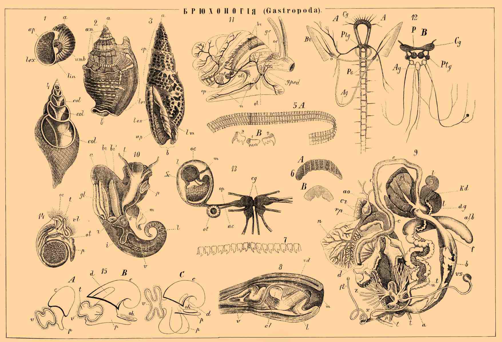 Рис. 1. Раковина Natika lineata спереди: а — верхушка; ap — отверстие; l. ex — наружная губа; l. in — внутренняя губа; umb — пупок. Рис. 2. Strombus auris Dianae, раковина сзади; а — верхушка; b — основание; an — оборот раковины (anfractus); l. ex — наружная губа. Рис. 3. Mitra Papalis, раковина спереди: а — верхушка; b — основание; sp — завиток (spira), состоящий из отдельных оборотов (anfractus); ap — отверстие; l. ex, l. in — наружная и внутренняя губа. Рис 4. Раковина Fusus в продольном разрезе, чтобы показать веретено (columella) — col. Рис. 5. Зубчатка, или терка, Buccinu m undatum. А — цельная терка (radula); B — отдельный член зубчатки: 1 — срединная, 2 — боковые пластинки. Рис. 6 . А — челюсть садовой улитки Helix pomatia; B — челюсть слизня — limax agrestis. Рис. 7. Член зубчатки прудовика, Limnaea stagnalis. Рис. 8. Tri don nodiferum, продольный разрез через ротовую полость и глотку: m — ротовое отверстие; rd — зубчатка; l — язык (его мышцы); с. l. — хрящ языка; v — влагалище зубчатки. Рис. 9. Анатомия садовой улитки, Helix pomatia (из легочных): а — глотка; b — слюнные железы; f — желудок; с — кишка; d — прямая кишка; l — печень; r — почка; р — стенка легкого; v. p. — легочная вена; cr. — сердце; ао — аорта; k. d. — половая (гермафродитная) железа; dg — ее выводной проток. alb — белковая железа; ut — матка (uterus); z — придаточные половые железы; р — мужской член (penis); fl — жгут (flagellum); y — мешок любовных стрел; х — половое отверстие; t — щупальца. Рис. 10. Modulus trochiformis (из переднежаберников). Внешний вид животного, вынутого из раковины: t — щупальца; mc — мускул, прикрепляющий животное к раковине (musculus columellaris); p — penis; hr — жабра; hr1 — обонятельный орган; m. naf. — придаточная жабра; gl — слизистая железа; а — заднепроходное отверстие; r — отверстие почки. Сквозь покров туловища просвечивают с — сердце, l — печень, v — желудок, i — кишка. Рис. 11. Paludina vivipara (из переднежаберников); расположение нервной и кровеносной системы: atr — предсердие; vnt — желудочек сердца; br — жабра; gc — головной нервный узел; g. ped. — ножной узел с прилегающим слуховым пузырьком ot; ос — глаз; n — нерв; ар — крышечка на ноге (operculuv). Рис. 12. Нервная система брюхоногих. А — Haliotis (из переднежаберных); cd — головной (церебральный) узел. plg — слитые плевраьлные и педальные узлы. ре — ножные нервные стволы; ag — абдоминальный ганглий; о — органы обоняния. Br — жабры. Виден перекрест висцеральной коммиссуры. В — прудовик, Lemnaea (из легочных): cg — головные узлы; Р — ножные; Plg — плевральные узлы; Ag — абдоминальный ганглий. Висцераьлная коммиссура без перекреста. Рис. 13. Pterotrachea Friderici (из Киленогих). Головные узлы и органы чувств; cg — головные узлы; ot — слуховой пузырек; в центре которогопомещается клуптый отолит; ос — глаз, помещенный в особую прозрачную капсулу — sc и двигающийся при помощи мускулов (m); l — хрусталик; ор — зрительный, ас — слуховой нерв. Рис. 14. Личинка Vermetus (переднежаберника); t — щупальца; vl — мерцательный парус, velum; oc — глаз; ot — слуховой пузырек; р — нога. Рис. 15. Личинки брюхоногих в стадии паруса (veliger); схематические изображения А и В — переднежаберники; С — из крылоногих (Cumbulia). c — раковина; v — парус (velum); p — нога; t — щупальца; ор — крышка на ноге (opeculum); p — дыхательная (мантийная полость).