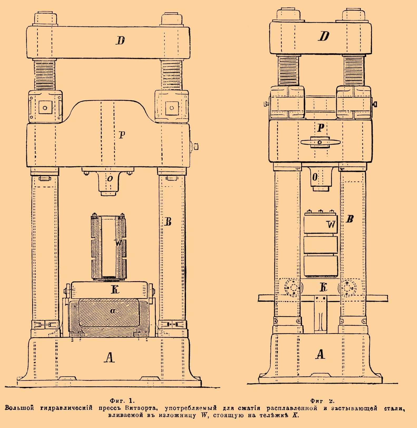 Фиг. 1, фиг. 2. Большой гидравлический пресс Витворта, употребляемый для сжатия расплавленной и застывающей стали, вливаемой в изложницу W, стоящую на тележке К.