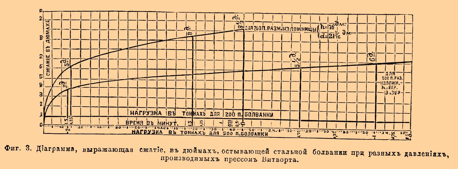 Так как расплавленная сталь вследствие малой сжимаемости жидкостей представляет почти такое же сопротивление, как и металл в твердом виде, то очевидно, что работа прессования совершается тогда, когда при отвердевании сталь переходит в пузыристое и тестообразное состояние. Вся работа весьма наглядно изображается на прилагаемой диаграмме (фигура 3, Будзинского); ординаты показывают сжатие металла, абсциссы — груз, производящий это сжатие; кроме того, ось абсцисс разделена на части, показывающие ход работы в минутах.
