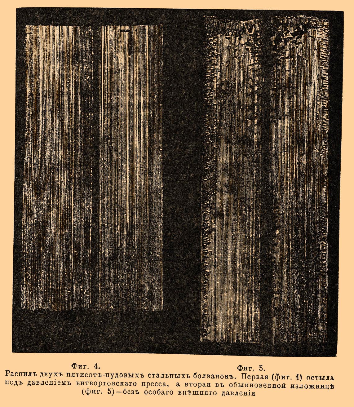 Фиг. 4, фиг. 5. Распил двух пятисотпудовых стальных болванок. Первая (фиг. 4) остыла под давлением витвортовского пресса, а вторая в обыкновенной изложнице (фиг. 5) — без особого внешнего давления.