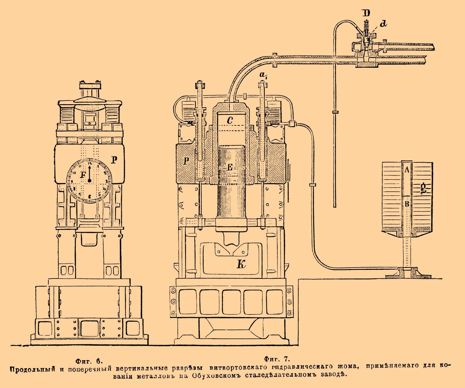 Фиг. 6, фиг. 7. Продольный и поперечный вертикальные разрезы витвортовского гидравлического жома, применяемого для кования металлов на Обуховском сталеделательном заводе.