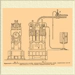 Пространство С над поршнем большого цилиндра соединено с коробкою D, куда вгоняется насосами вода с манометрическим давлением 2 3/8 тонны. У малых же цилиндров пространство под поршнями соединено трубкою, наполненною водою, с трубою аккумулятора, груз которого уравновешен с весом всех трех поршней E, a и a 1. Самая работа ковки производится следующим образом: открывая клапан d в нагнетальной коробке, воду насосов направляют над поршень большого цилиндра, через что все 3 поршня опускаются, при этом большой поршень производит сжатие металла, лежащего на наковальне, малые же поршни давят на воду, имеющуюся под их поршнями, и этим давлением подымают уравновешенный груз аккумулятора. Если закрыть клапан нагнетательной коробки, то давление на большой поршень прекратится и тогда поднятый груз аккумулятора по закону жидкости в сообщающихся сосудах начнет опускаться, а все 3 поршня подымутся. Таким образом груз, уравновешенный с 3 поршнями, представляет собою как бы две чашки весов. Англичане эту систему даже так и называют балансир-аккумулятором. На Обуховском заводе ход поршня 9 1/2 футов, а площадь 1000 кв. дюймов; следовательно, давление, производимое при ковке (2,357 х 62 х 1000), = около 150000 пудов; уравновешивающий груз баланец аккумулятора = 2000 пудов, давление производится 4 нагнетательными насосами диаметром = 5 дюймам, ход поршня 40 д. Насосы приводятся в движение паровою машиною о двух цилиндрах (d = 36 д., ход 4 ф.), силою в 270 паровых лошадей. Пар доставляют 3 котла (диам. = 7 ф., длина 30 ф., поверхность нагрева 1026 кв. фут.), давление до 80 фунтов, машина делает от 40 до 45 оборотов в минуту; 7 оборотов маховика опускают поршень на высоту 1 фута. Так как при опускании и подымании клапана приходится преодолевать сильное давление струи воды, идущей от насосов, то поэтому движения эти делаются при посредстве особого большого аккумулятора, груз которого доходит до 8000 пудов. Для наблюдения за величиной сжатия при ковке с кующим поршнем соединена стрелка, которая указанием на циферблате F дает возможность вести ковку в размере с точностью до полудюйма. Экономическое преимущество жома над молотом видно из того, что на ковку казенной части для 12-д. пушки в 35 калибров (диаметров отверстия орудия) под 50-тонным молотом болванка в 2200 пуд. весом требовала не менее 7 выносов (нагревов в печи), так что ковка длилась в течение целой недели; для той же работы под жомом нужно всего только 2 выноса и требуются только одни сутки. Те же сравнительные результаты получались и на заводе Джон-Браун в Шеффильде, а именно: стальная болванка в 36500 кило (2280 пуд.) при отковке ее в 35 см (почти 6 д.) орудия в 36 калибров длиною обрабатывалась под 50-тонным молотом три недели, причем ей давали 33 нагрева; под жомом же Витворта силою 4000 тонн такая болванка была отделана в 4 дня при 15 нагревах. Еще более поразительные результаты получаются у Витворта при ковке на штревеле (болванка с высверленным каналом), причем масса металла в 17 тонн весом и диаметром в 49,5 д. в 15 минут доводится до 38 д. и вся работа исполняется одним мастером и двумя рабочими. При ковке предметов не столь большого веса считают, что жом уменьшает число нагревов наполовину, а продолжительность его работы = 3/4. Введением жома Витворт сильно удешевил дорогую операцию ковки больших предметов (которая под 50-тонновым молотом обходится в 50 р. за час ковки)