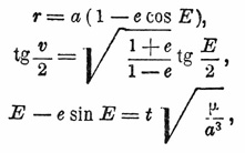 где E — эксцентрическая аномалия, есть вспомогательная переменная. В этих формулах a означает большую полуось эллипса, e — его эксцентриситет.