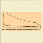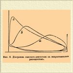 В нормальной диаграмме (рис. 7) линия расширения газов проходит значительно выше адиабаты. Последнее обстоятельство, по мнению Клерка, обуславливается тем, что при максимуме температуры, часть газов не успевает сгореть и догорает лишь во время охлаждения, — подобно тому, как это наблюдается при взрыве в запертых сосудах. Точно таким же образом происходит горение и в газовых двигателях без предварительного сжатия: расположение линии расширения зависит главным образом от быстроты охлаждения. Если охлаждение слишком велико, то, несмотря на быструю передачу тепла газам, эта линия может расположиться ниже адиабаты; если же охлаждение ослаблено, она пойдет выше адиабаты.