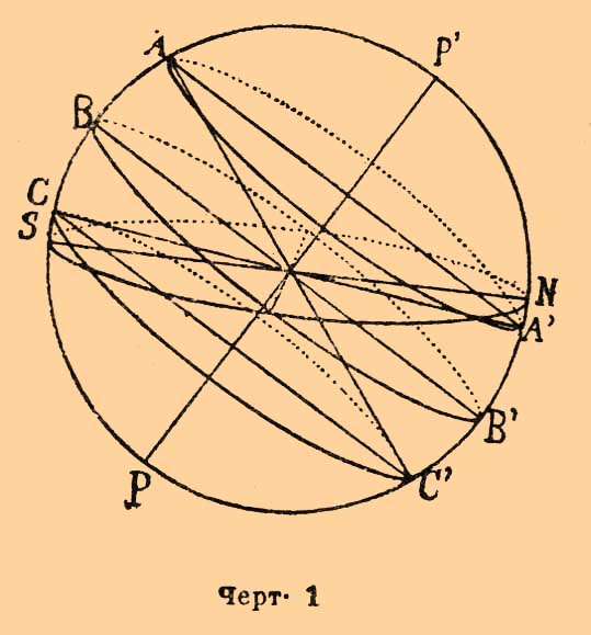 — Для многих опытов по оптике необходимо пропускать пучок лучей солнечного света, отраженный от зеркала, через ряд приборов, тщательно установленных один за другим на горизонтальном столе или скамейке. Но Солнце имеет кажущееся непрерывное движение, описывая во время своего видимого суточного обращения около оси мира РР' (черт. 1) один из малых кругов небесной сферы.