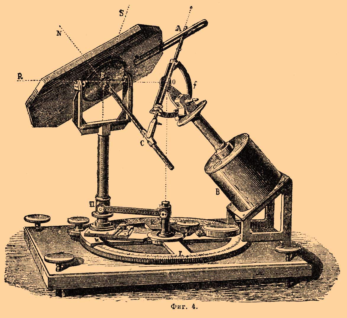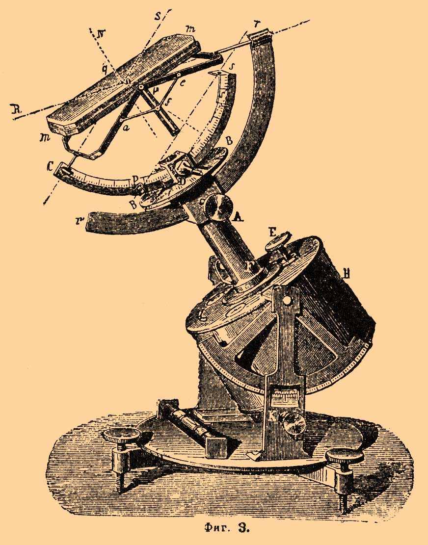Часовой механизм, помещенный в коробке H, вращает всю дугу cs вокруг оси F, параллельной оси шара, а рамки, поддерживающие зеркало, вращаются около осей Со и or; поэтому нормаль oN к зеркалу сама собой остается всегда в плоскости обоих лучей и движение продолжается свободно во все время дня, от восхода до заката. С помощью дуги наклон оси устанавливают по широте места наблюдения, потом винтом D завинчивают cs так, чтобы указатель стоял на делении, обозначающем месяц и число дня наблюдения, причем на другой поверхности этой дуги нониус покажет соответственный угол склонения солнца. Тогда останется поставить стрелку циферблата ВВ на истинное время наблюдения, пустить в ход механизм и поворачивать весь прибор около вертикальной оси его основания, пока луч, проходящий через дырочку визира s, не упадет на середину пластинки p. Направить отраженный луч на желаемое место можно, передвигая дугу rr' и поворачивая ее плоскость около оси мира при посредстве винтов А и Е. Недостаточная прочность частей Г. Зильбермана, висящих частью на главной оси часового механизма, и малые размеры направляющего четырехугольника не допускают помещения большого зеркала, и мешают полной правильности движения. В Г. Фуко (фиг. 4) зеркало опирается на особую, прочную подставку и поэтому может быть взято произвольных размеров.