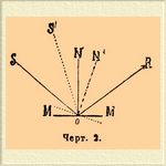Вторым по простоте устройства надо считать Г. Литрова (Августа, Гартнака), где плоскость зеркала параллельна оси мира, а вращение происходит около этой же оси со скоростью полуоборота в 24 часа. В дни равноденствия, когда Солнце движется по экватору, луч, падающий на зеркало Г., и перпендикуляр к плоскости этого зеркала в точке падения будут оба заключены в плоскости экватора, поэтому и отраженный луч останется в той же плоскости. При установке прибора можно так повернуть зеркало, что отраженный луч станет горизонтальным; но он будет в этом случае направлен к точке запада или к точке востока, потому что по этой линии пересекается горизонт с плоскостью экватора. Отраженный луч не изменит своего направления во время суточного движения, если зеркало будет вращаться по тому же направлению, как солнце, но с половинной скоростью. После поворота зеркала ММ на угол NON' (черт. 2), угол отражения RON уменьшится на NON'; на столько же должен уменьшиться и угол падения SON', чтобы отраженный луч сохранил прежнее направление OR, следовательно SOS = 2NON'.