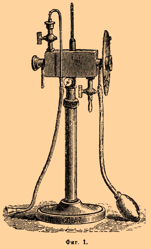 Несмотря на позолоту, первые признаки росы заметить очень трудно, а при сильном сухом ветре она даже вовсе не появляется; поэтому приходится часто охлаждать больше чем нужно и редко удается сблизить показания термометра, при которых роса появляется и исчезает ближе чем на 1 или 2 градуса. Поэтому Г. Даниеля старались усовершенствовать, хотя с довольно умеренным успехом, Добберейнер, Реньо, Аллюар, Сир и др. Лучшим из всех оказывается в настоящее время Г. Крова с внутренней конденсацией, описанный в 1883 г. в "Journal de Physique". Чтобы лучше заметить первый легкий налет росы и вполне защитить охлаждаемую поверхность от влияния близости наблюдателя, а также от случайных токов воздуха, автор придал своему прибору форму (фиг. 1) закрытого латунного ящичка, через который проходит тонкостенная трубка, закрытая на одном конце матовым стеклом, а на другом — слабой лупой.
