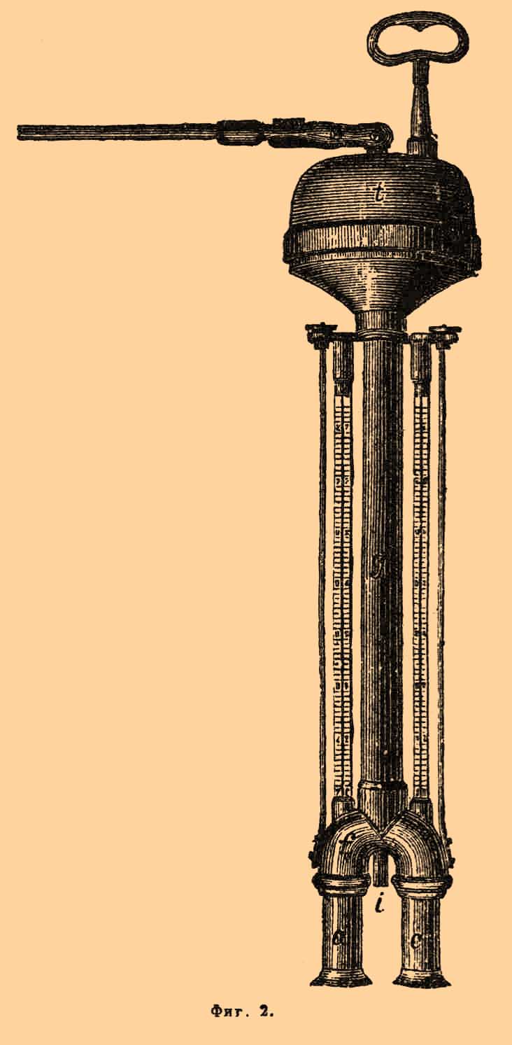 зависимость между упругостью паров в воздухе hh1, температурами t и t', высотой барометра В и упругостью h пара, насыщающего пространство при t. Сам Август вывел свою формулу теоретически, не принимая во внимание многих условий опыта; попытки других ученых вывести более основательную формулу тоже не увенчались успехом и теперь следует смотреть на психрометр как на очень удобный прибор, дающий точные результаты только помощью эмпирически составленных формул или таблиц. Реньо в 1845 и 1853 гг. нашел, что коэффициент в формуле Августа надо изменять, смотря по условиям опыта, от 0,00074 (на ветру) до 0,00128 (в небольшой комнате). При температурах ниже нуля надо снимать с шарика кисею и смачивать его перед самым наблюдением кистью, чтобы образовался лишь тонкий слой льда тогда на ветру можно получать порядочные результаты, вводя в формулу коэффициент 0,00069. В спокойном, комнатном воздухе, смоченный термометр беспрестанно меняет свои показания, а на ветру он скоро приходит к устойчивому наименьшему показанию, поэтому уже в 1855 г. Дойер (Doy è re) ввел психрометр-пращу, т. е. заставлял как сухой, так и влажный термометр быстро вращаться в воздухе, как праща. Впоследствии для этого стали устраивать особые механизмы с зубчатыми колесами. Наблюдения можно было вычислять по той же формуле Августа, вводя коэффициент 0,00069. Еще удобнее психрометр с вентилятором, приводимым в движение пружиной; такой прибор описан Р. Ассманом в 1892 году в "Zeitschrift f. Instrumentenkunde" (фиг. 2).