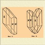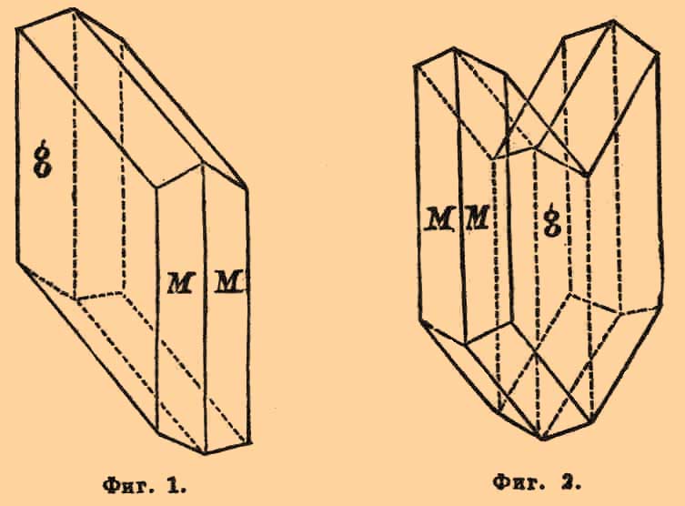 Гипс (минерал). Химический состав гипса — CaSO 4 + 2Н 2 O, водный сернокислый кальций; кристаллическая система моносимметрическая, образует простые кристаллы и двойники (фиг. 1 — простой кристалл; M — призма, g 1 — параллельно плоскости симметрии; фиг. 2 — двойниковый кристалл; те же обозначения; фиг. 3 — двойниковое образование, известное под именем "ласточкина хвоста").