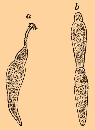 Часто внутренняя часть содержимого цисты не распадается, а окружается новой оболочкой (псевдоцистой). Содержимое каждой споры (псевдонавицеллы) заключает сначала 1 ядро, но потом в ней образуется 6-8 небольших серпообразных телец (спорозоитов), которые, по всей вероятности, и развиваются в Г. У некоторых они проходят амебообразную стадию. К Г. близки кокцидии, микроспоридии и саркоспоридии (см.), вместе с которыми они составляют класс споровиков (Sporozoa). Рассказы о Г ., живущих в волосах человека, основаны на ошибке.