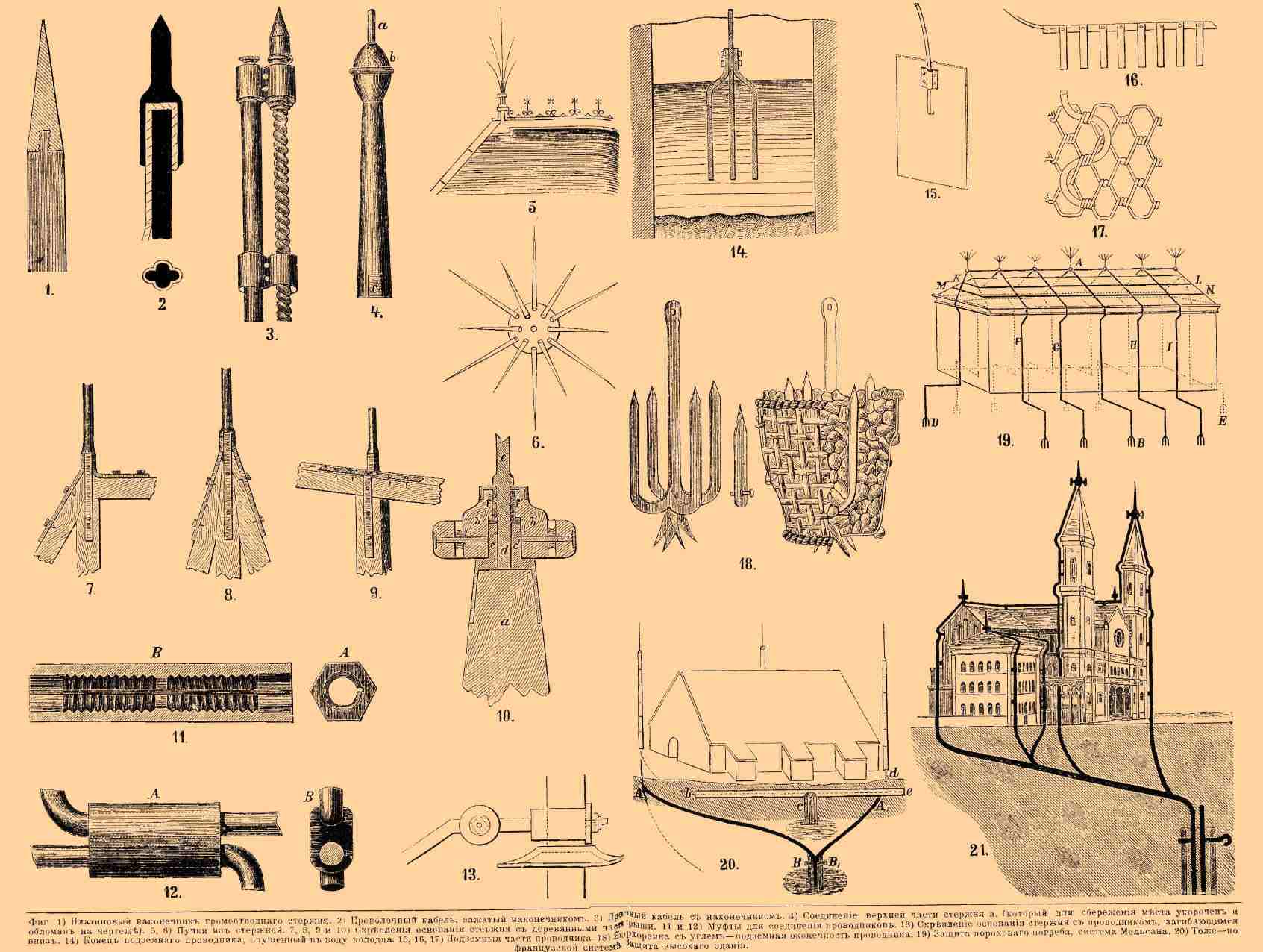 Фиг. 1) Платиновый наконечник громоотводного стержня. 2) Проволочный кабель, зажатый наконечником. 3) Проволочный кабель с наконечником. 4) Соединение верхней части чтержня а, который для сбережения места укорочен и обломан на чертеже. 5, 6) Пучки из стержней. 7, 8, 9 и 10) Скрепления основания стержня с деревянными частями крыши. 11 и 12) Муфты для соединения проводников. 13) Скрепление основания стержня с проводником, загибающимся вниз. 14) Конец подземного проводника, опущенный в воду колодца. 15, 16, 17) Подземные части проводника. 18) Якорь и корзна с углем — подземная оконечность проводника. 19) Защита порохового погреба, система Мельсана. 20) То же — по французской системе. 21) Защита высокого здания.