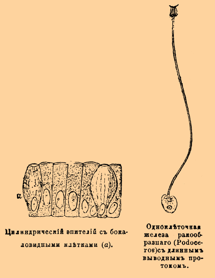 Железы (анат.). В гистологическом отношении Ж. представляют собой всегда эпителиальные образования. Существенную часть всякой Ж. составляет поверхность, выстланная эпителием, клетки которого и заведуют выделением данных веществ; это выделительная поверхность, выстланная железистым эпителием. Выделительная способность составляет, таким образом, свойство эпителиальной ткани; простейший случай ее проявления заключается в том, что между обыкновенными клетками эпителия поодиночке рассеяны отдельные выделительные клетки, образуя так называемые одноклеточные Ж. Часто такая Ж. лежит в одном ряду с остальными эпителиальными клетками, отличаясь от них лишь более раздутой формой и содержанием выделяемой ею жидкости. Жидкость эта выходит наружу или просто путем разрыва клетки, или же для ее выхода на верхнем конце клетки находится особое отверстие. Часто верхняя часть клетки вытягивается в трубочку, образуя выводной проток одноклеточной Ж. Когда эта трубочка достигает значительных размеров, тогда самая Ж. не может уже лежать на одном уровне с остальными эпителиальными клетками и перемещается в подлежащую ткань, ниже эпителия, между клетками которого проникает лишь ее выводной проток. Выделительная клетка с ее выводным протоком становится похожа на ягоду, сидящую на стебельке. Одноклеточные Ж. чрезвычайно распространены между беспозвоночными, но встречаются и у позвоночных; таковы, например, бокаловидные клетки кишечника, выделяющие слизь.