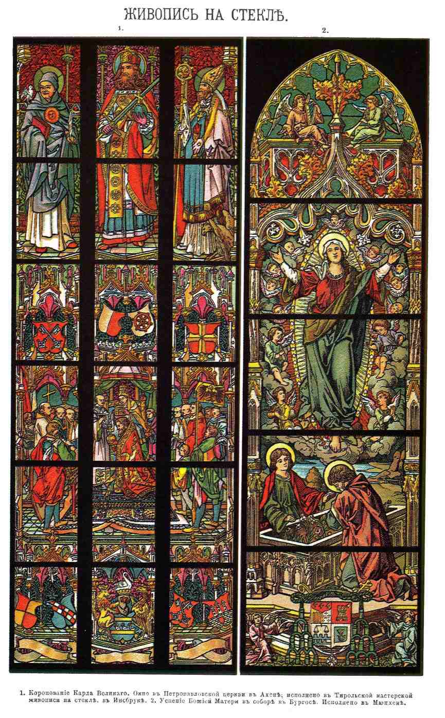 1. Коронование Карла Великого. Окно в Петропавловской церкви в Ахене; исполнено в Тирольской мастерской живописи на стекле, в Инсбруке. 2. Успение Божьей Матери. В соборе в Бургосе. Исполнено в Мюнхене.