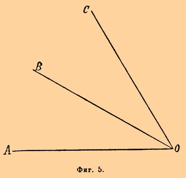 По той же причине платье с продольными полосками делает человека выше, с поперечными — толще. 2) Острые углы мы склонны видеть увеличенными, тупые уменьшенными; из двух равных острых углов тот кажется большим, одна из сторон которого горизонтальна (фиг. 5, АОВ = ВОС).