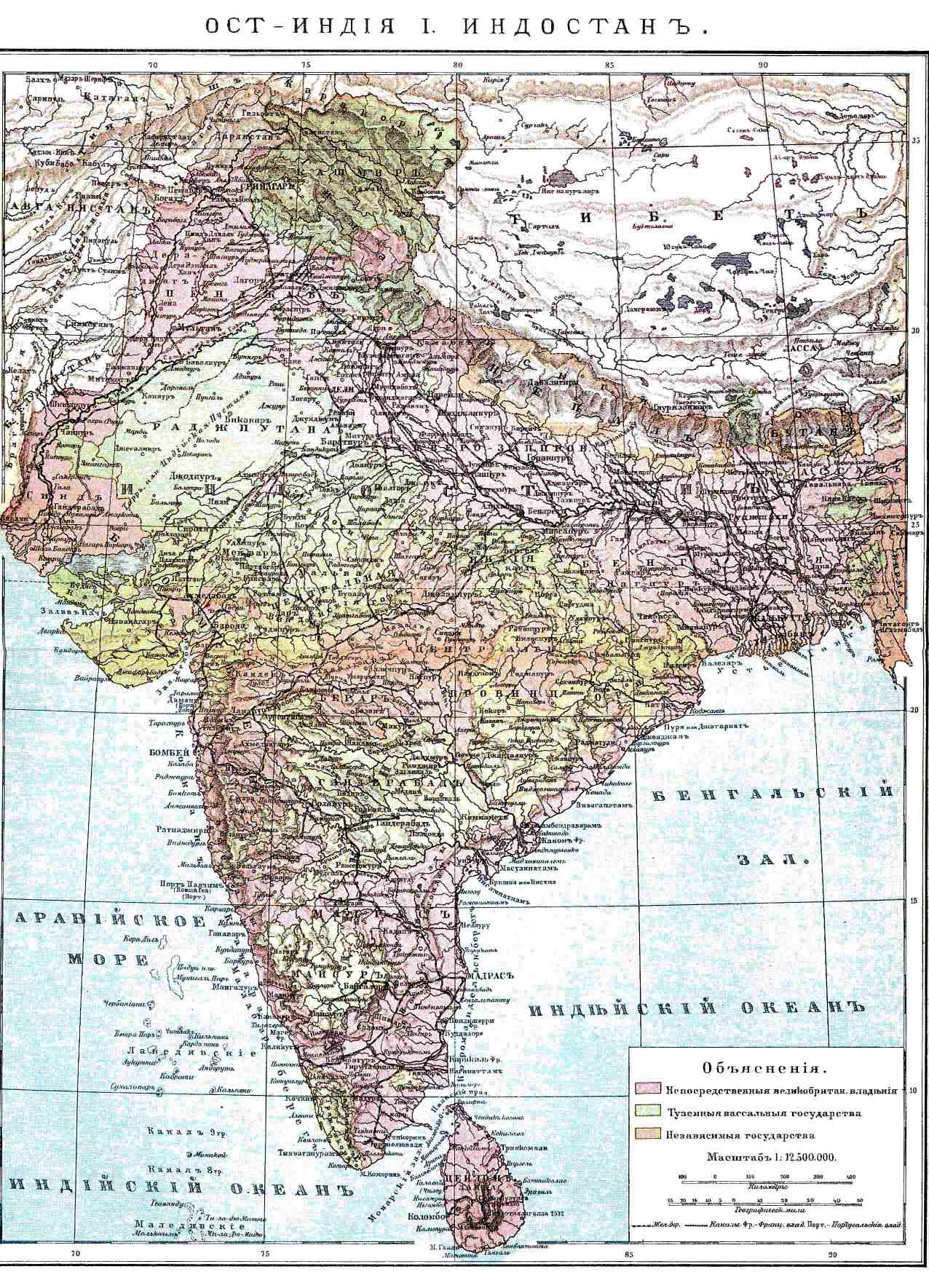 Название. — Так европейцы давно называли богатые страны Южной Азии, о которых имели лишь смутные понятия; об "Индеи богатой" упоминают и наши былины. Колумб, как известно, думал достигнуть И. западным путем и когда открыл сначала Багамские и Антильские о-ва, а затем материк Южной Америки, то был вполне убежден, что достиг своей цели. В том же были сначала убеждены и его современники. Поэтому туземцев новых испанских владений в Америке, а затем и всей Северной Америки стали называть индейцами (исп. Indios, франц. Indiens, нем. Indianer, англ. Indians), а совет испанского короля по делам этих владений — Consejo real у supremo de las Indias. Название индейцы по отношению к американским краснокожим так укоренилось, что его нельзя вывести из употребления, вследствие чего жителей И. обозначают именами индусы (англ. и нем. Hindus, франц. Indous). Когда португальцы открыли морской восточный путь в И., то современники были убеждены, что они достигли восточной части страны, а испанцы — западной. Отсюда название, и до сих пор применяемое к о-вам между Сев. и Южн. Америкой. Русское Вест-Индия взято с нем. Westindien (франц. Indes Occidentales, англ. West Indies). И. и соседние с ней о-ва до сих пор на западноевропейских языках часто называются Восточной И.; отсюда и русское Ост-Индия, с нем. Ostindien (фр. Indes Orientales, англ. East Indies). Голландцы называют Малайский архипелаг островной Индией (Insulinde). Впрочем, теперь и на западноевропейских языках, и по-русски общепринято название И. (фр. Inde, нем. Indien, англ. India) для обозначения среднего из 3 южных полуостровов Азии с соседней частью материка до Гималайских гор на С. Соседний с ним восточный из 3 южных полуостровов Азии обыкновенно называется Индокитаем (фр. Indo-Chine). Здесь эти два полуострова будут рассмотрены вместе в физическом отношении. Вся И., за исключением Непала, входит в состав непосредственных владений Великобритании и ее вассальных государств, или, как теперь выражаются, составляет Индо-Британскую империю, обнимающую и всю западную часть Индокитая.