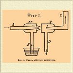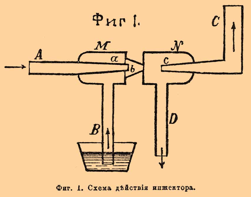 Две закрытые камеры M N, сообщающиеся между собой посредством конического (в виде насадки) сужения b, снабжены четырьмя трубками. Первая из них — паропроводная трубка А — оканчивается конической насадкой а; вторая — водоподъемная трубка В - погружена в открытый резервуар с холодной водой; третья — водопроводная трубка С -оканчивается в камере N узким концом конической насадки с, и, наконец, последняя — отводная трубка D — открывается свободно в атмосферу. Пар, пущенный по трубке А из парового котла в прибор, вытекает из насадки а со значительной скоростью в виде тонкой струи, которая при проходе через соединительную часть b будет высасывать находящийся в камере M воздух и увлекать его вместе с паром в камеру N, а затем по трубке D наружу. При этом в камере M образуется разреженное пространство, и вода под влиянием атмосферного давления подымется из нижнего резервуара по трубке В вверх и наполнит всю камеру М. Притекающий пар, встречая на своем пути холодную воду, будет сгущаться, выгоняя через насадку b струю смеси нагретой воды с не сгустившимся еще паром. Струя эта, приобретя надлежащую плотность и силу, входит в насадку с и по трубе С проводится дальше в котел. Отводная труба D, таким образом, служит для удаления воздуха и пара, а также лишней воды при начале действия прибора. Изобретение И., сделано в 1858 г. Жиффаром (Giffard). Устройство И. Жиффара показано на фиг. 2.