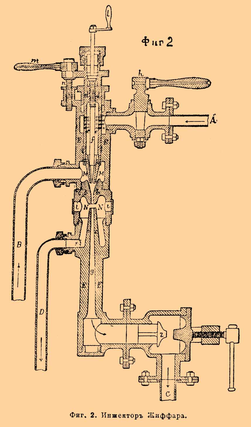 Он состоит из длинной цилиндрической (наружной) коробки ЕЕ, сообщающейся при помощи двух трубок (А — паропроводной и С — водопроводной, или питающей) с паровым котлом и посредством трубки В — всасывающей — с резервуаром питающей воды (напр. тендером паровоза); наконец, трубка D — вестовая, открываемая свободно в атмосферу. Внутри прибора вставлена плотно подвижная трубка d, имеющая посередине несколько рядов небольших круглых отверстий ее и оканчивающаяся конической паровой насадкой а, которая помещается внутри всасывающей камеры М. Непосредственно под паровой насадкой расположена водяная насадка b, открывающаяся внизу внутри нагнетательной камеры N. Здесь же установлена также приемная насадка с, принимающая воду и подающая ее дальше, по трубе С, в паровой котел. Впуск пара производится по трубке А при помощи паровпускного крана h, вставленного в паропроводный патрубок, а регулировка притока пара исполняется посредством цилиндрического стержня, заостренного на конце, или так называемого шпинделя f, снабженного посередине винтовой нарезкой. Поворачивая его за рукоятку l, можно по желанию открывать больше или меньше выпускное отверстие паровой насадки а. Приток же воды регулируется с помощью ходового винта n, поднимающего или опускающего трубку d, вследствие чего увеличивается или уменьшается кольцеобразный зазор между насадками а и b, через который протекает всасываемая струя питающей воды. По бокам нагнетательной камеры N сделаны два небольших отверстия ii. В нижней части прибора, у входа в питающую трубу С, помещен обыкновенный тарелочный клапан z, плотно закрывающийся давлением пара в котле. Действие рассматриваемого И. заключается в том, что пар, притекающий к нему из котла по трубке А, входит через упомянутые выше круглые отверстия ее в паровую трубку d, а затем вытекает оттуда в виде тонкой струи из паровой насадки а. При этом он выгоняет из прибора по вестовой трубе D весь заключающийся в нем воздух, вследствие чего вода из наружного резервуара подымается по трубе В вверх и заполняет всю всасывающую камеру М. Тогда пар, продолжающий вытекать из насадки а, встречая на своем пути холодную воду, будет конденсироваться и станет выгонять ее в виде струи нагретой воды из насадки b, вследствие чего из вестовой трубы D будет вытекать наружу вода, смешанная с паром. Такое состояние будет продолжаться до тех пор, пока приток пара и воды не будет установлен надлежащим образом, что достигается легко по опыту, при помощи рукояток l и m, и определяется прекращением выделения воды и пара из вестовой трубы. Момент этот узнается также по слуху.