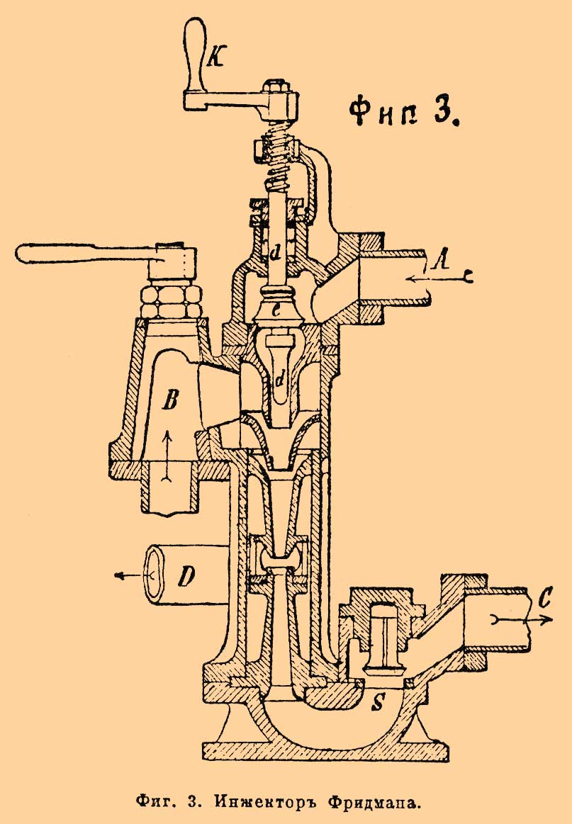 Однако с усовершенствованием конструкции И. он все больше вытесняет из употребления поршневой насос при питании пароходных котлов, локомобилей и даже котлов постоянных паровых машин. Материалом для постройки И. в настоящее время почти исключительно служит чугун, и только одни сопла (насадки) приготовляются из бронзы. И. разделяются на всасывающие, которые должны подымать воду, забирая ее из некоторой глубины, и невсасывающие, приспособленные к действию лишь в таких условиях, когда резервуар с питающей водой помещен в то же отверстие парового сопла И. и вода притекает к прибору самотеком. В настоящее время существует очень много различных типов И., но все они основаны на одном и том же начале, выраженном в И. Жиффара в первоначальной его конструкции, впрочем, почти уже не встречающемся в употреблении. К более известным, распространенным в практике, принадлежат И. Робинсона, Болера, Фридмана, Кертинга и др. И. Фридмана (фиг. 3), весьма распространенный в промышленности, имеет сложные водяные сопла, т. е. состоящие из двух или большего числа отдельных насадок, причем вода всасывается через кольцеобразные между ними зазоры.