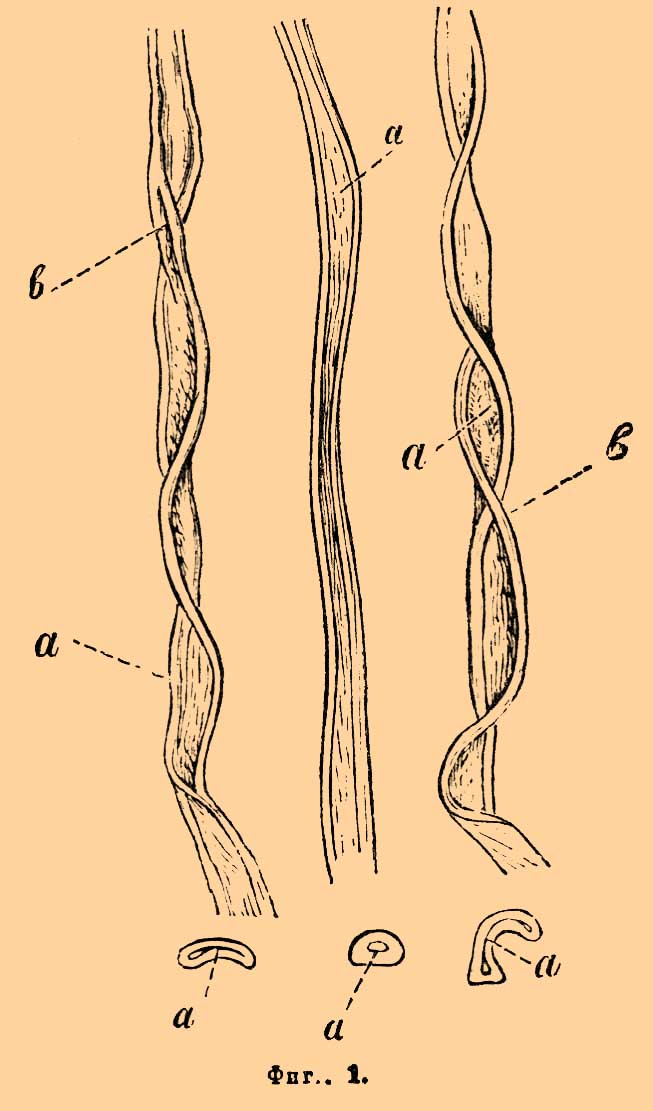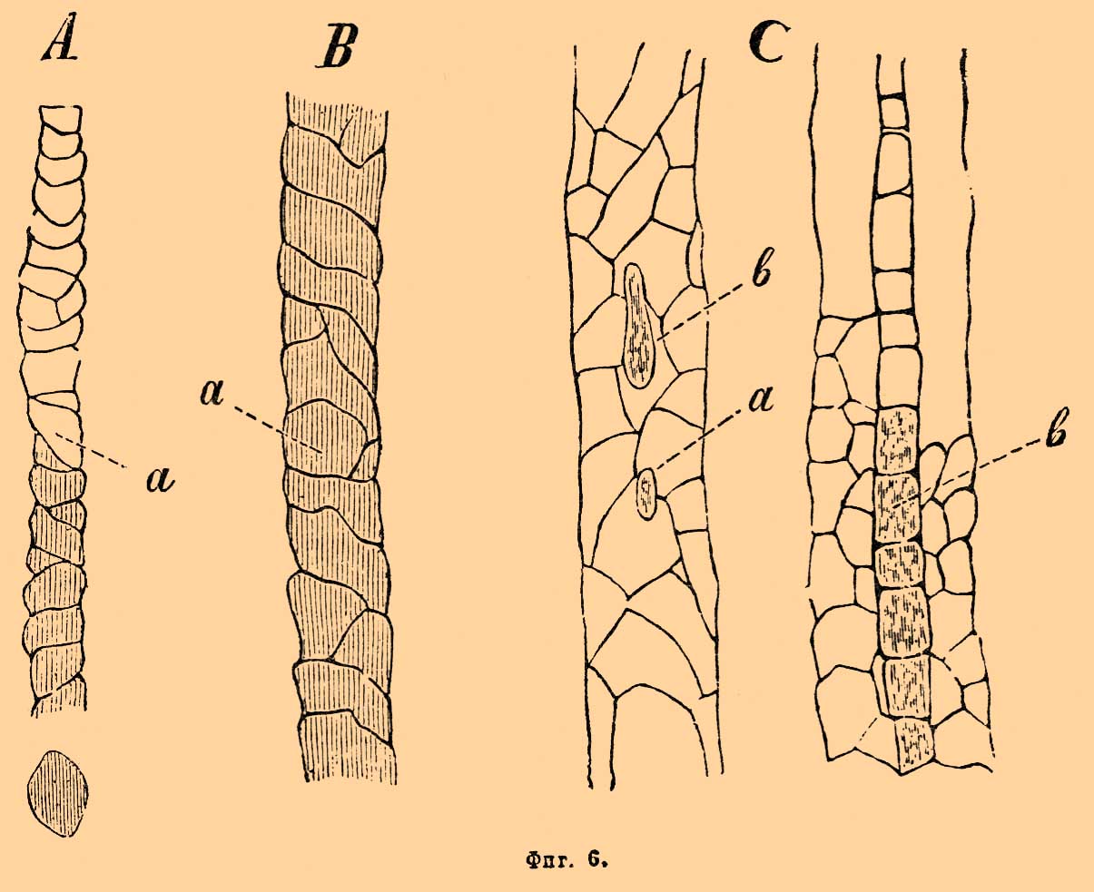 Широкая сравнительно полость а принимает вид линии с приближением к верхнему концу волокна; в виде линии — нередко с разветвлениями — представляется она и в поперечном сечении. Так же часто, как у льна, встречаются поперечные трещины, коленные уступы b, продольные бороздки. Концы — тупы, с очень толстыми стенками, иногда имеют отростки с. Поперечные сечения всегда образуют плотные группы, при чем каждое сечение характеризуется округленным контуром и образованными из многих слоев стенками. Длина элементарного волокна 5-55 мм (особ. часто 15-25 мм), диаметр 16-50 ммм (особ. часто 22 ммм), так что отношение длины к диаметру равно приблизительно 1000. Главные отличия пенькового волокна от очень сходного с ним, как видели, льняного, сводятся к следующему: 1) льняные волокна не образуют таких плотных пучков; 2) контуры поперечных сечений пеньковых волокон, при обработке их йодом и серной кислотой, окрашиваются в желтый цвет, чего не бывает у льна; 3) внутренний канал у льняного волокна почти всегда содержит протоплазму, у пенькового же — крайне редко; 4) у каждого волокна — своя форма концов.