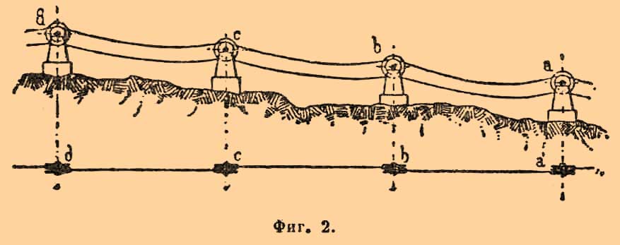 Вместо поддерживающих шкивов здесь применяются двойные шкивы, т. е. с двумя желобами по окружности обода, так что передача составляется из ряда отдельных коротких канатных передач. На фиг. 2 показаны четыре передаточные станции: а, b, с и d. Желобы шкивов соответствуют толщине каната и часто выкладываются деревом, кожей, гуттаперчей или просмоленными нитками. Концы каната соединяются в сплетень, т. е. каждый конец несколько разматывают и, вырезав часть пенькового сердечника, сплетают взаимно все проволоки.