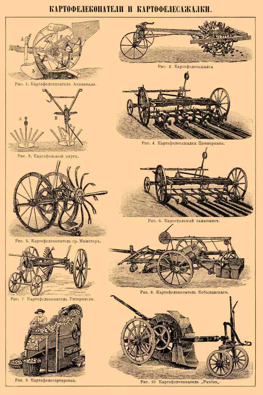 Рис. 1. Картофелекопатель Аспинваля. Рис. 2. Картофелесажалка. Рис. 3. Картофельный плуг. Рис. 4. Картофелесажалка Циммермана. Рис. 5. Картофелекопатель гр. Мюнстер. Рис. 6. Картофельный запашник. Рис. 7. Картофелекопатель Унтерильпа. Рис. 8. Картофелекопатель Кобылинского. Рис. 9. Картофелесортировка. Рис. 10. Картофелекопатель "Paulus".