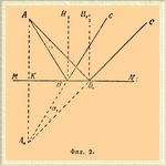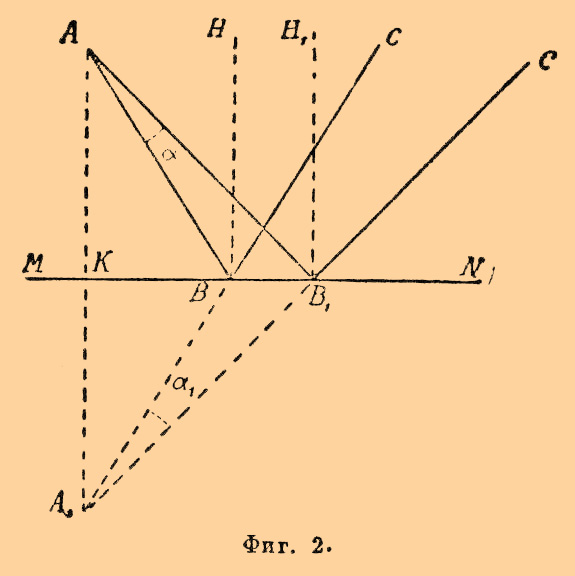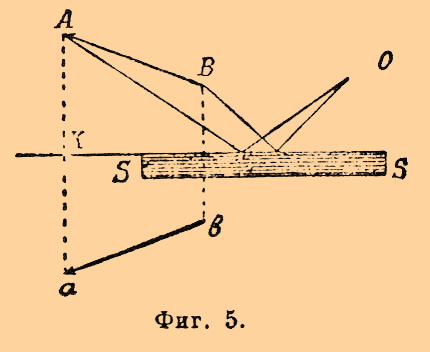 Плоские зеркала. Простейший случай отражения представляет отражение от плоского зеркала. Мнимое изображение точки А (фиг. 2) получается в А' на расстоянии от зеркала MN равном А'К = АК, и в этом случае α ' = α. Совокупность точек, представляющих предмет AB, дает за зеркалом мнимое изображение его ab (фиг. 5), равное предмету по величине и расстояние точек которого от зеркала равно расстоянию соответствующих точек предмета от зеркала.