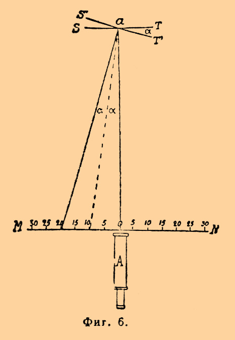 Пусть имеется свободное вращающееся вокруг какой-либо оси тело (фигура 6; на ней ось перпендикулярна бумаге и пересекает ее в точке а); прикрепим к телу зеркало ST, вращающееся вместе с телом, и установим на некотором расстоянии l от зеркала зрительную трубу, посредством которой наблюдаем мнимое изображение в зеркале шкалы MN, расположенной под трубой, перпендикулярно к оси вращения а; при положении зеркала ST мы видим в трубе деление о шкалы; при повороте предмета, а с ним и зеркала, в положение S'T', на угол α, мы увидим в трубе уже x-ое деление шкалы, так как теперь луч xa, идущий от него, отразившись от S'Т, попадет в трубу; находим угол α из зависимости: