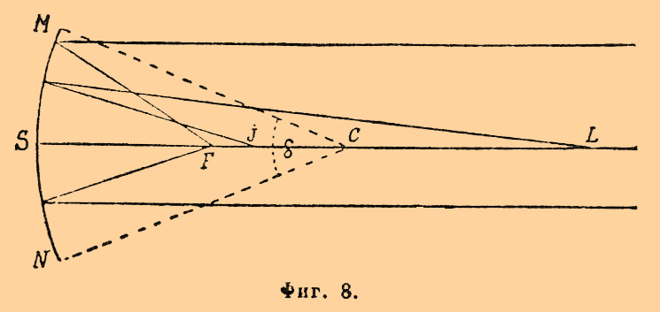 Угол, под которым из центра шаровой поверхности видно само зеркало, называется его угловым отверстием (MCN), диаметр зеркала тоже иногда называют его (линейным) отверстием. Зеркала с небольшим отверстием (10-15°) с достаточною точностью апланатичны. Если источник находится в таком большом расстоянии, что лучи, идущие от какой-либо точки его, близко параллельны между собою, то, отразившись от такого зеркала, от разных точек его (фиг. 8), они пересекутся в одной точке F, называемой главным фокусом зеркала, и дадут в случае вогнутого зеркала — действительное, в случае выпуклого — мнимое изображение предмета, лежащее на расстоянии от центра кривизны CF, равном r/2, где r — радиус шаровой поверхности. Если светящуюся точку от бесконечности будем приближать к вогнутому зеркалу, то изображение ее будет перемещаться вдоль главной оси, приближаясь к центру кривизны зеркала С, и наконец совпадет с этим центром, когда и светящийся предмет будет в центре зеркала, т. е. тогда предмет и его изображение совпадут. По мере того, как точка, приближаясь к зеркалу, будет перемещаться от С к F, изображение будет удаляться от С, и наконец, когда точка придет в F, изображение ее уйдет по оптической оси бесконечно далеко. Приближая точку еще больше, заметим, что теперь лучи отражаются уже расходящимся пучком, следовательно, дают мнимое изображение, которое по мере приближения предмета от F к вершине быстро приближается от бесконечности тоже к вершине. Во всех положениях точки L она связана так с положением своего изображения J, что, поместив точку в L, мы получим изображение в J, поместив же точку в J — изображение получим в L; по причине этих свойств эти две точки называют сопряженными фокусами. Положение этих точек по отношению к зеркалу определяется выражением