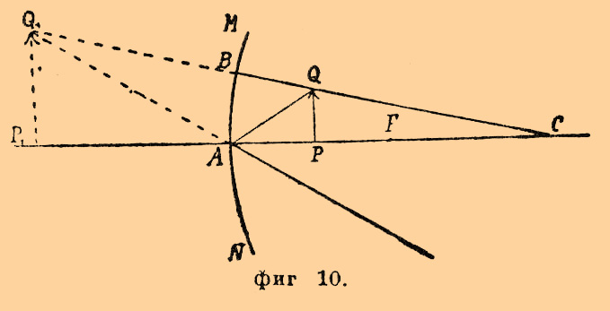 Главный мнимый фокус их (фиг. 11) — место схождения продолжений лучей, отраженных от зеркала, если источник света находится на главной оси бесконечно далеко — лежит за зеркалом на расстоянии от него равном r/2. По мере приближения точки от бесконечности к зеркалу мнимое изображение ее перемещается от главного фокуса F к зеркалу. В выпуклых зеркалах зависимость между d, f и F дается выражением