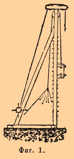 Горизонтальная рама составляется обычно из продольного бруса, в который упираются стрелы, одного или двух, врубленных в него, поперечных брусьев (хвост рамы) и соединяющих их подкосов. Кроме того, между стойками укрепляется наклонный брус, упирающийся в ту же горизонтальную раму. В некоторых К. стрелы, направляющие бабу, помещаются впереди, независимо от стоек, образующих остов К., причем у основания они прикрепляются к выдвинутым вперед поперечным брусьям горизонтальной рамы; это дает возможность забивать без особых приспособлений сваи, расположенные ниже плоскости, на которой стоит К. (система Перроне). Стойки, а иногда и подкосы, снабжаются перекладинами, которые образуют лестницу для влезания на К. Баба висит на толстом канате, называемом лопарем. Он перекинут через шкив, укрепленный на горизонтальной оси в вершине стоек. К лопарю привязываются тонкие веревки — кошки, за которые берутся рабочие. В машинном К., употребляемом при более плотных грунтах, конец лопаря наматывается на барабан, насаженный на оси вала, приводимого во вращение рабочими при помощи шпиля (фиг. 2).