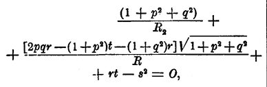 где p=dz/dx; q=dz/dy; r=d2z/dx2; s=d2z/dx.dy; t=d2z/dy2. Если деформировать (изгибать) нерастяжимую поверхность, то К. начерченных на ней линий изменяется, но К. проекции такой кривой на касательную плоскость для точки соприкосновения остается неизменной. Лиувилль называет эту К. геодезической. Линия, геодезическая К. которой на всем ее протяжении равна нулю, назыв. геодезической; все плоскости соприкосновения геодезической линии нормальны к поверхности. К. поверхностей. Понятие о К. на поверхности было расширено Гауссом следующим образом: начертим на данной поверхности произвольную замкнутую кривую С, ограничивающую некоторую площадь А; проведем из центра сферы, описанной радиусом, равным единице, прямые, параллельные нормалям поверхности, проведенным в точках кривой С. Эти прямые, выходящие из центра сфера, составят конус, который вырежет на сфере некоторую площадь А', которую Гаусс называет интегральной К. При уменьшении площади А до совпадения всех частей ее в одну точку предел отношения A'/A и назван Гауссом К. поверхности в точке М, в которую обратился контур A. Если R1 и R2 радиусы К. главных сечений, то К. поверхности равна 1 /R1R2. Гаусс доказал при этом теорему: интегральная К. треугольника, образованного тремя геодезическими линиями, равна сумме углов этого криволинейного треугольника за вычетом двух прямых. Смотря по тому, имеют ли R1 и R2 одинаковые знаки или противоположные, — К. поверхности будет положительной или отрицательной. Если один из этих радиусов К. R1 или R2 обращается в бесконечность, то К. поверхности равна нулю. К. развертывающихся поверхностей во всех точках равна нулю.