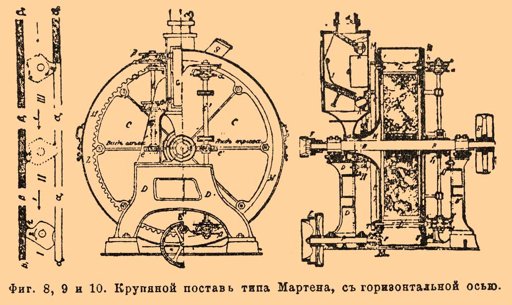 Фиг. 8, 9 и 10. Крупяной постав типа Мартена, с горизонтальной осью.