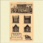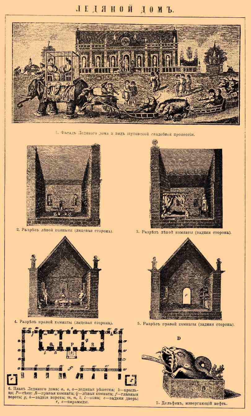 1. Фасад Ледяного дома и вид шутовской свадебной процессии. 2. Разрез левой комнаты (лицевая сторона). 3. Разрез левой комнаты (задняя сторона). 4. Разрез правой комнаты (лицевая сторона). 5. Разрез правой комнаты (задняя сторона). 6. План Ледяного дома: a, a, a — ледяная решетка; b — крыльцо; P — сени; R - правая комната; Q — левая комната; f — главные ворота; g, h — задние ворота; m, n, k, l — окна; c — задняя дверь; r, s — пирамиды. 7. Дельфин, извергающий нефть.