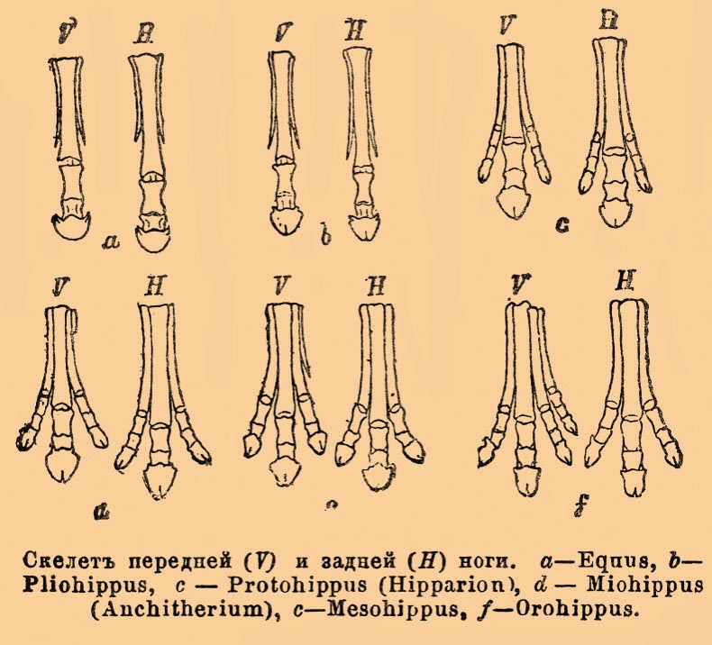 Скелет передней (V) и задней (H) ноги. a — Equus, b — Pliohippus, c — Protohippus (Hipparion), d — Miohippus (Anchitherium), c — Mesohippus, f — Orohippus.