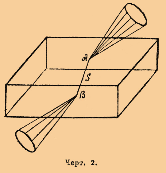 Если вторая грань кристалла (противоположная той, на которую луч падает) параллельна первой, то лучи, выйдя через нее из кристалла, идут параллельно SA по цилиндрической поверхности. Существование такого случая преломления есть необходимое следствие формы поверхности световой волны для двуосных кристаллов. Эта поверхность, как показывает математический анализ, имеет 4 впадины, благодаря чему к ней можно провести 4 таких касательных плоскости, которые будут иметь не по одной общей точке с поверхностью волны, а по общей окружности. Предположим теперь, что нам дан луч, падающий на двуосный кристалл и мы, пользуясь построением Гюйгенса (см. эту фамилию; также Свет, теория), ищем ход этого луча после преломления; может случиться, что положение грани кристалла относительно его осей, плоскость падения луча и угол падения будут таковы, что та касательная к поверхности волны плоскость, которую приходится проводить при построении Гюйгенса, совпадет с одной из вышеуказанных 4-х плоскостей и, следовательно, коснется поверхности волны не в одной точке, а по окружности и определит собой не один преломленный луч, а бесчисленное множество лучей, проходящих через точку падения луча и любую точку окружности, по которой происходит касание, т. е. идущих по конической поверхности.