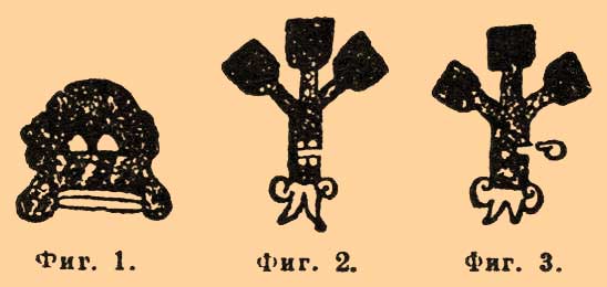 — У мексиканцев не было особого шрифта. Собственные имена лиц и местностей, а также иногда целые предложения обозначались разными изображениями и условными знаками. Так, например, фиг. 1 представляет условное изображение горы (tepe-tl), с двумя значками (tlan-tli) внутри, что вместе обозначает имя Tepetitlan (внутри гор). Фиг. 2 представляет дерево (qua-huitl), со значками (tlan-tli) — вместе имя Quauhtitlan (внутри леса). Фиг. 3 — дерево (qua-hui t l) с изображением перед ним язычка, вместе — имя Quauhnahuac (в лесу).