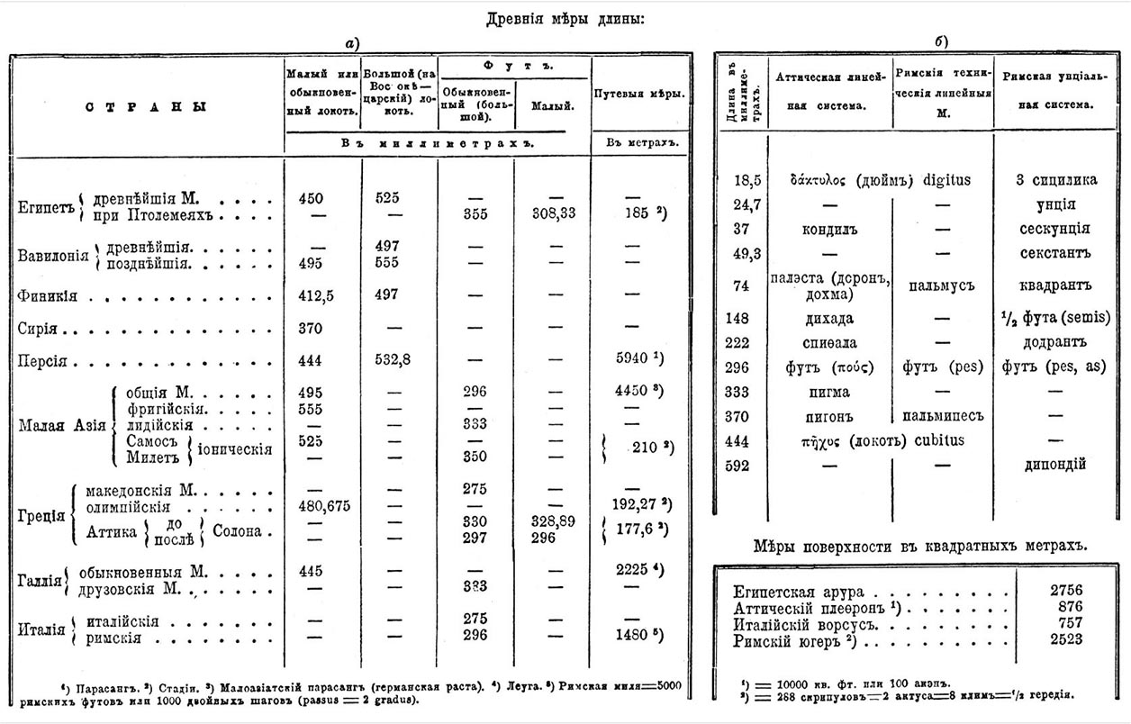М. древних народов. Первой страной, которая сильно рознящиеся у отдельных индивидуумов измерения, заимствованные от размеров человеческого тела (см. Метрология), привела к определенной норме, является Египет. Здесь установилась основная М., равнявшаяся длине части руки от оконечности локтя до конца среднего пальца в 450 мм или 6 ладоней = 24 раза шир. пальца. Так как царские М. считались всегда больше обыкновенных, то в Египте получилась двойственность систем, отразившаяся и у других древних народов. Связь линейной М. с остальными была последовательно проведена еще у египтян: квадрат 100 больших локтей давал аруру (см. Таблицы), половина куба царского локтя давала 1 хотеп, а главная и почти единственная единица веса, тен, вероятно, был выведен из веса кубического малого локтя воды = 91,125 литров = 1000 тен = 200 хин. Египетские системы М. подверглись сильному видоизменению в Вавилонии, давшей им далекое распространение и потому считающейся часто родиной европейских М. Вавилония ввела добытую астрономическим путем (видимый в равноденствие полукруг орбиты = 360 диаметрам Солнца) шестидесятеричную систему счета (см. соотв. статью). Путь, проходимый взрослым мужчиной в 2 минуты (срок между первым лучом солнца и появлением всего диска), дал меру, известную под греческим названием стадий, путь одного часа (= в 30 раз более) дал персидский парасанг. Система мин и талантов, от вавилонян перешедшая к грекам и т. д., несомненно, зависела от египетской: тяжелый талант = 666 2/3 тен или 2/3 малого египетского кубического локтя воды. Сирия, особенно Финикия, сыграли в распространении мер роль передаточных пунктов: от них получила свое содержание италийская система, более архаичная, чем греческие. От сирян перешло к грекам название мины (μνα, mina) и статора, происшедшего из сирийского шекел (сикел) = 13,64 г Вместо локтя, служившего основн. М. на Востоке, в Греции таковым начинает появляться фут, причем особое распространение получила афино-еврейская система с футом в 297 мм = 3/5 старовавилонского локтя, куб которого давал 26,198 кг воды. Из многочисленных греческих государств наибольшее значение имели М. и вес афинян; об изменениях этих М. в начале VI в. см. Солон. Позднейшая афинская система, перенятая и Тиром, Антиохиею и Птолемеями, появилась со II в. до Р. Х. Куб древнейшего вавилонского, или финикийского, локтя в 497 мм дает вес воды в 122,76 кг = антиохийскому дровяному таланту; 1/6 его (20,47 кг) = талант птолемеевский, или позднейший аттический. В Италии фут в 275 мм служил нормой в течение около 2 столетий до окончательного слияния ее с Римом; он выведен был, как 1/2 шага, из парасанга. В Риме фут в 296 мм появился в III в., но долго не мог осилить прежнюю систему; он основан на локте в 444 мм. Весовая система в Риме была в первое время иного происхождения: она, как и М. емкости, представляла сходство с сицилийской и переносила в Рим перешедшие сюда через Карфаген древнейшие вавилонские нормы. В Галлию, а также в Германию нормы М. проникли через Массалию, занесшую сюда ново вавилонскую систему, основанную на локте в 555 мм; на нем основан и друзовский фут в 333 мм. Леуга, давшая название франц. lieuе, приравнивалась 1 1/2 римск. милям, между тем как малоазиатский парасанг, сделавшийся германской путевой мерой — раста и потом перешедший в lieue de France, был выведен из парасанга персидского, 3/4 которого он представляет. Точн