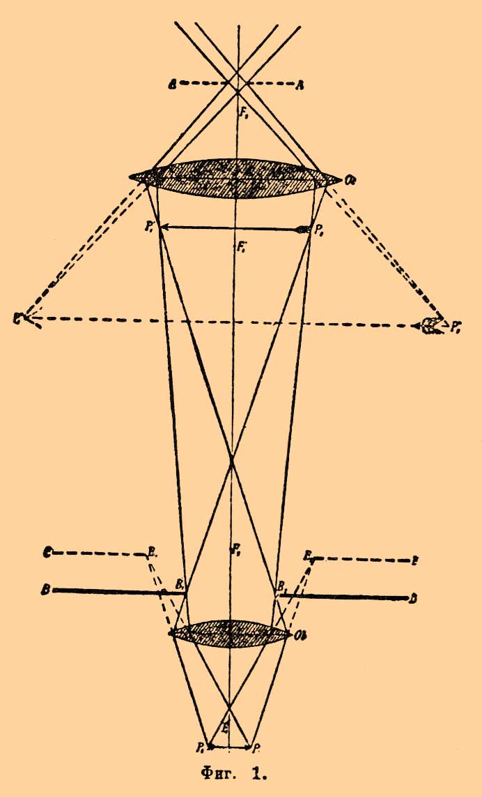 Для достижения возможно полного уничтожения аберрации в последнее время, по предложению профессора Аббе в Йене и по почину мастерской Цейса, начали применять разнообразнейшие сорта оптического стекла, особенно тяжелые борные и фосфатные стекла завода Шотта в Йене, а затем даже некоторые минералы (плавиковый шпат в мастерской Цейса). Таким путем Цейсу в Йене удалось достигнуть чрезвычайно полного уничтожения аберрации, особенно хроматической; такие объективы им названы апохроматическими. [ С них скопированы "семнапохроматы", "панапохроматы" и т. д. других оптиков.] При всех высоких своих достоинствах апохроматы страдают, однако, следующими недостатками: 1) поле резкого одновременного зрения у них весьма незначительно, т. е. когда центр изображения установлен на глаз резко, то края его нерезкие, и наоборот; этот недостаток апохроматов особенно резко выступает в микрофотографии. 2) Стекла, из которых составлены апохроматы, во влажном и теплом воздухе тропических стран со временем тускнеют.