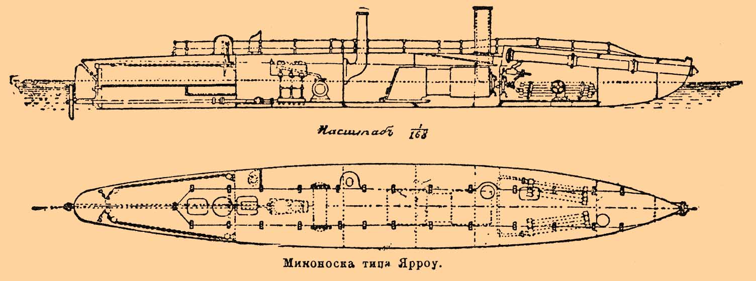 Шестовая мина в 1880-х гг. была брошена и заменена самодвижущейся (преимущественно Уайтхеда). Об устройстве миноносок можно судить по прилагаемому чертежу (миноноска Ярроу), который представляет вид большинства русских миноносок; построены они большей частью на заводе Ярроу в Англии или же по его чертежам — в России.