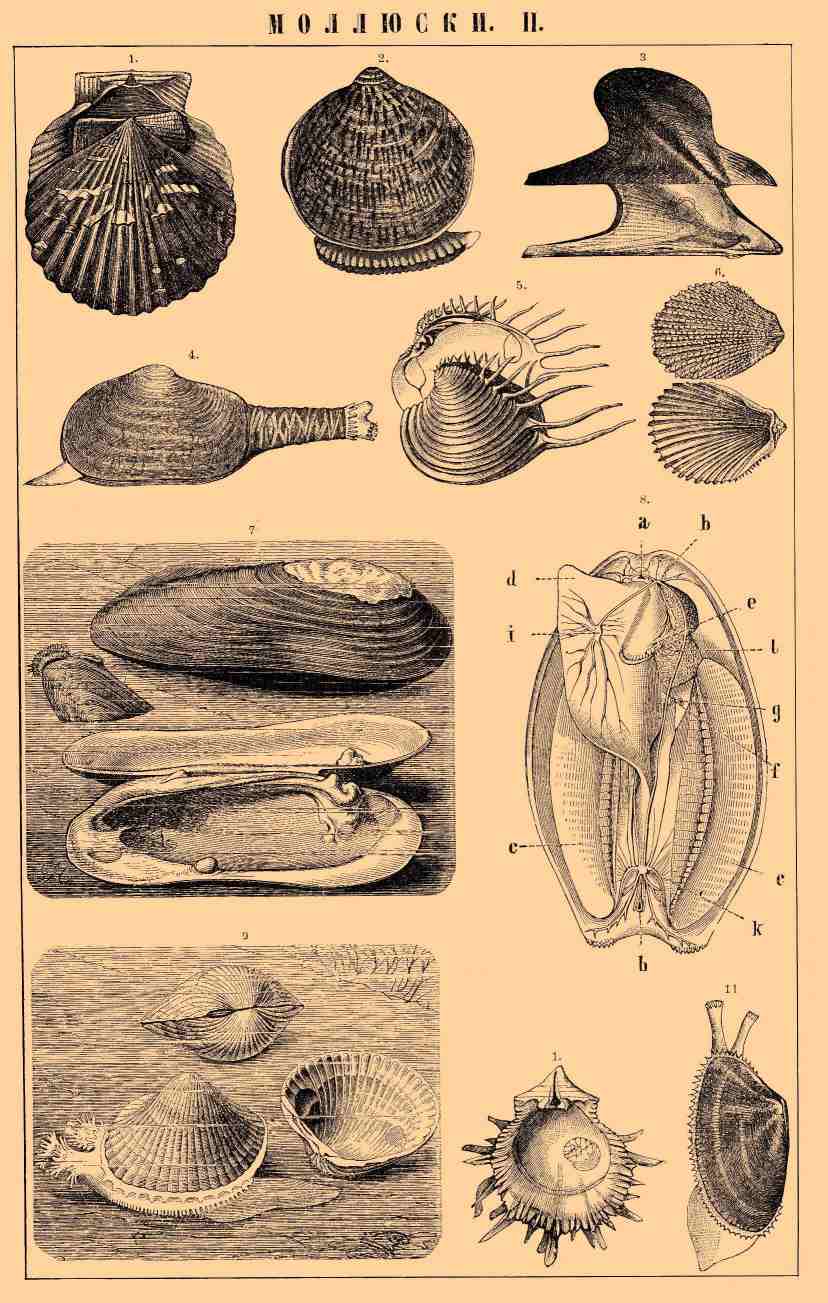 1) Морской гребешок (Pecten opercularis), одна створка снаружи, другая несколько выдающаяся из-под нее с внутренней стороны. 2) Pectunculus pilosus, сбоку. 3) Avicula semisagitta, одна створка снаружи, другая выдающаяся из-под нее с внутренней стороны. 4) Разевница (Муа truncata) сбоку, слева нога, справа длинная сифонная трубка. 5) Cytherea meretrix, одна створка снаружи, другая, выдающаяся из-под нее, — с внутренней стороны. 6) Лима (Lima squamosa), одна створка с наружной, другая с внутренней стороны. 7) Перловица жемчугоносная (Margaritana margaritifera); верхний экземпляр сбоку и несколько снизу, второй изображен зарывшимся в ил, кроме заднего конца, внизу раскрытия створки, на внутренней стороне одной из них приросшая жемчужина. 8) Беззубка (Anodonta), с брюшной стороны с врисованной нервной системой: а — рот, b — заднепроходное отверстие, с — жабры, d — нога, е — ротовые лопасти, f — половое отверстие, g — отверстие боянусова органа, h — головной узел, г — ножной узел, k — внутренностный узел, l — просвечивающие половые железы. 9) Сердцевидка съедобная (Cardium edule); вверху раковина с замочной (верхней) стороны; внизу и слева животное, выставившее из раковины ногу (справа) и края мантии с сифонами (слева), внизу справа створка раковины с внутренней стороны. 10) Створка Spondylus princeps с внутренней стороны; ясно видно место прикрепления мускула, смыкающего створки. 1 1) Donax anatinus с выставленной из раковины ногой (внизу), сифонами (вверху) и краем мантии. Все рисунки — пластинчатожаберные моллюски (Leimellibranchiata).