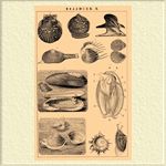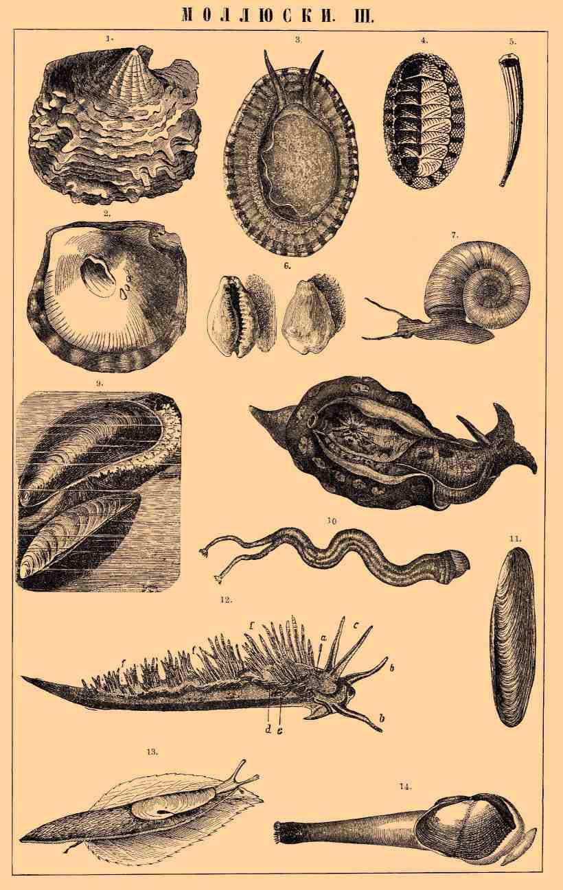 6) Каури (Cypraea moneta), левый экземпляр — снизу, правый — сверку. 7) Катушка (Planorbis corneus), сбоку. 8) Аплизия, или морской заяц (Aplysia depilans), сверху. 9) Ракушка съедобная, мидия (Mytilus edulis); верхний экземпляр сбоку, видны бахромчатые края мантии и биссус; нижний — сверху, со стороны замка. 10) Древоточец (Teredo navalis), сбоку. 11) Морской финик (Lithodomus dactylus), сбоку. 12) Эолида (Aeolis rufibranchialis), сбоку. a — глаз, е — ротовые, с — головные щупальца, d — заднепроходное отверстие, е — половое отверстие, f — спинные придатки, служащие органами дыхания (значительно увеличена). 13) Слизень (Limax agrestis), сверху и справа. 14) Камнеточец (Pholas crispata). сбоку; слева — трубка сифонов, справа выдается нога. Рис. 1, 2, 9, 10, 11 и 14 — пластинчатожаберные моллюски (Lamell i branchiata); рис. 3, 6, 7, 8, 12 и 13 — брюхоногие (Gastropoda), из них 3 и 6 — переднежаберные (Prosobranchiata), 7 и 13 — легочные (Pulmonata), 8 и 12 — зaднeжaбepныe (Opisthobranchiata); pиc. 4 — Amphineura; рис. 5 — лопатоногие (Scaphopoda).