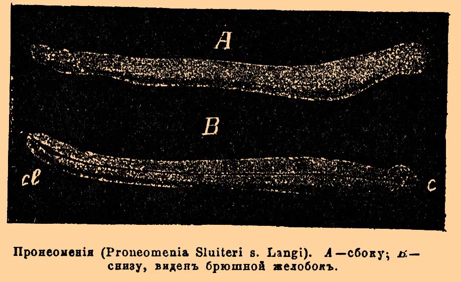 Пронеомения (Proneomenia Sluiteri s. Langi): A — сбоку, B — снизу, виден брюшной желобок.