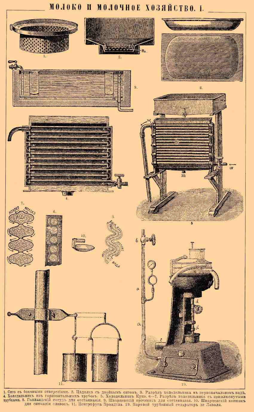 МОЛОКО И МОЛОЧНОЕ ХОЗЯЙСТВО. I. 1. Сито с боковыми отверстиями. 2. Цедилка с двойным ситом. 3. Разрез холодильника в первоначальном виде. 4. Холодильник из горизонтальных трубок. 5. Холодильник Кунэ. 6, 7. Разрез холодильника с приплюснутыми трубками. 8. Голландский сосуд для отстаивания. 9. Шварцевский приемник для отстаивания. 10. Шварцевский ковшик для снимания сливок. 11. Центрифуга Прандтля. 19. Паровой турбинный сепаратор де Лаваля.